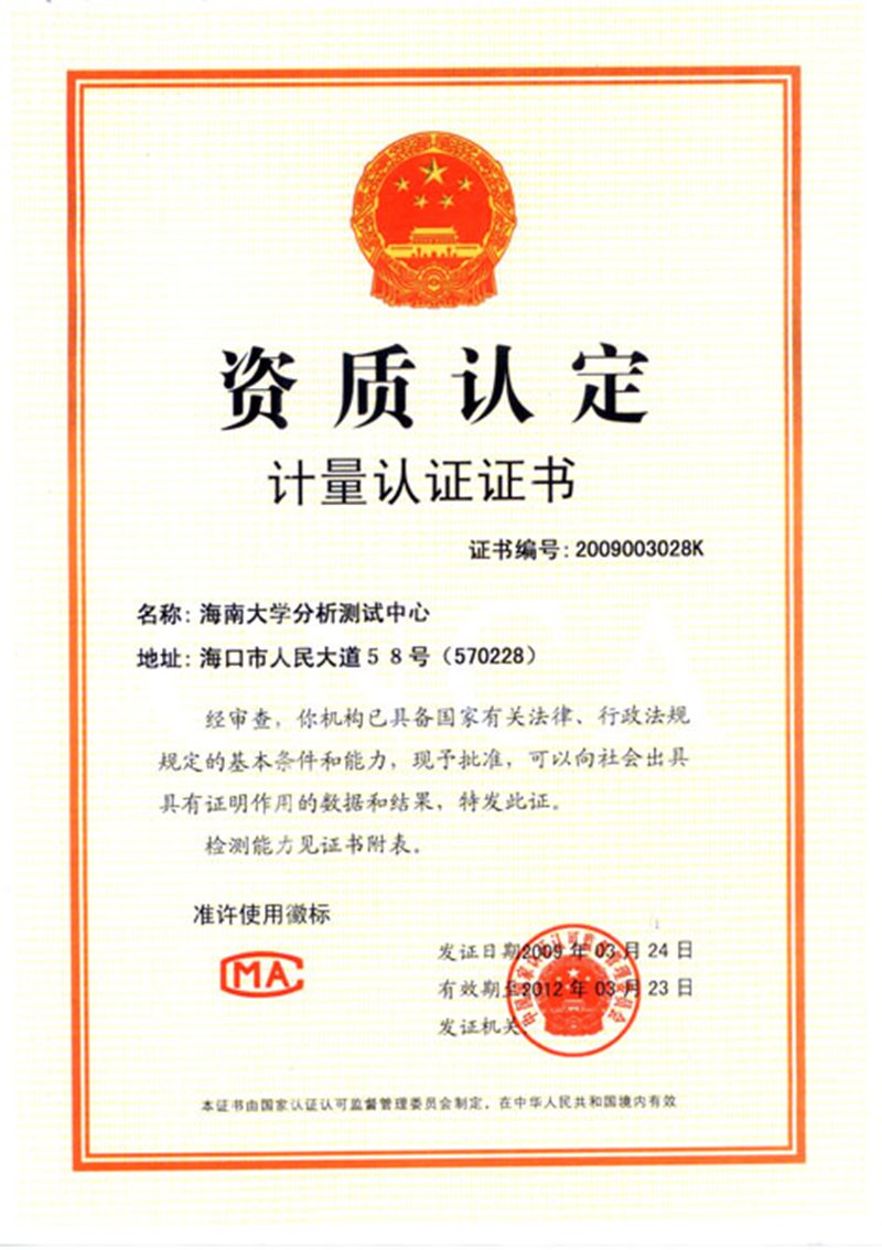 此证书的获得,有利于中心对外开展服务从而提高大型仪器的利用率,有助于提高我校服务社会的影响力和知名度。这也是我校“211工程”建设中科研基础条件资源共享公共平台建设上的重要进步,也是以中心为依托单位的“海南省大型科学仪器协作共用平台”建设中的一件喜事。