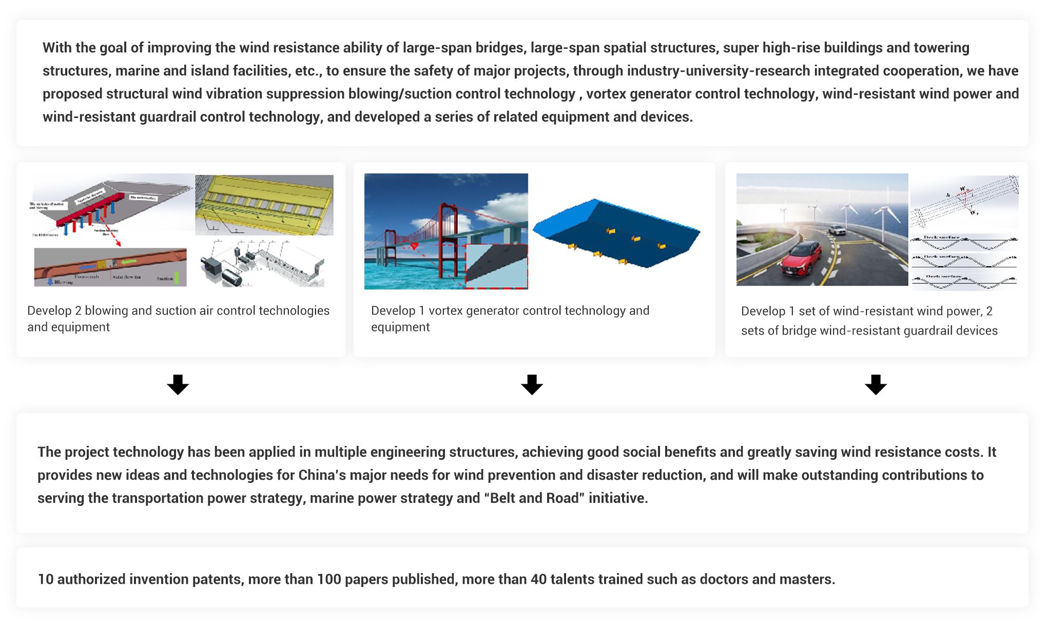 With the goal of improving the wind resistance ability of large-span bridges, large-span spatial structures, super high-rise buildings and towering structures, marine and island facilities, etc., to ensure the safety of major projects, through industry-university-research integrated cooperation, we have proposed structural wind vibration suppression blowing/suction control technology , vortex generator control technology, wind-resistant wind power and wind-resistant guardrail control technology, and developed a series of related equipment and devices.