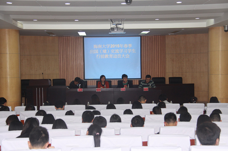 会上,国际合作交流处林仕岛老师介绍了我校2014年和2015年春季学生出国(境)交流学习项目情况,并向学生提出出国(境)交流学习外事纪律要求,教务处王冬梅老师向学生讲解出国(境)学习教务相关政策,学生工作处黄良颖老师介绍了学生在国(境)外管理有关规定。我校2014年出国(境)交流学习学生代表、赴新加坡南洋理工大学暑期研修班学生李汶锦为大家介绍了自己交流学习期间的所见所感,并为即将出国(境)交流学习的同学提出了建议。将赴美国夏威夷大学蒙诺分校交流学习的王慧晨同学代表2015年春季我校出国(境)交流学习学生做了发言,衷心感谢学校给予的宝贵机会,表示在外一定努力学习专业知识,并提高自身综合素质,遵纪守法,严于律己,积极维护海南大学的形象与中国的国际形象。