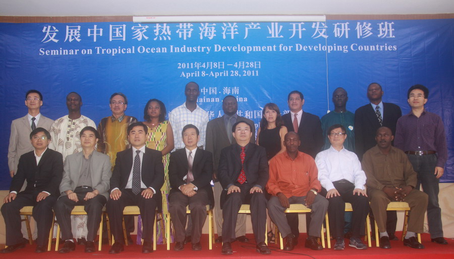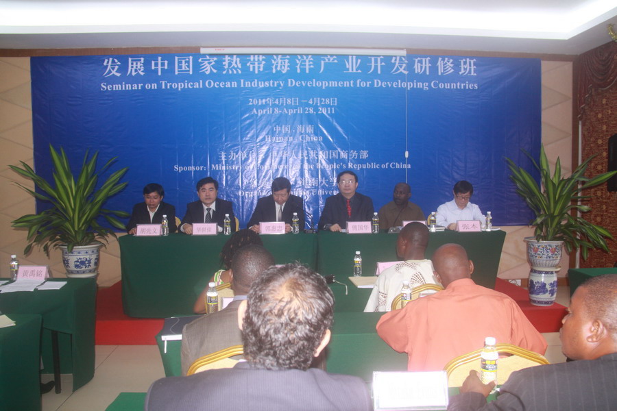 4月8日上午,由商务部主办、我校承办的“发展中国家热带海洋产业开发研修班”开班仪式在千岛海景酒店隆重举行,来自马来西亚、印度尼西亚、桑给巴尔、加纳、秘鲁、塞拉利昂、马拉维、津巴布韦、苏丹等9个亚洲、非洲国家的15名渔业、畜牧业、农业、工业等部门的官员参加了本次研修班。本次研修班旨在使学员了解热带海洋开发战略、热带海洋环境保护及管理、热带海水鱼类、贝类养殖现代技术、海洋食品开发技术、海洋休闲旅游产业开发等方面的前沿信息,同时了解海南作为国际旅游岛的发展状况及未来前景,为发展中国家的热带海洋产业开发提供借鉴和参考。