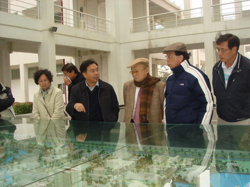 严庆副校长(左二)陪同陈世英先生(左三)参观我校校园规划沙盘