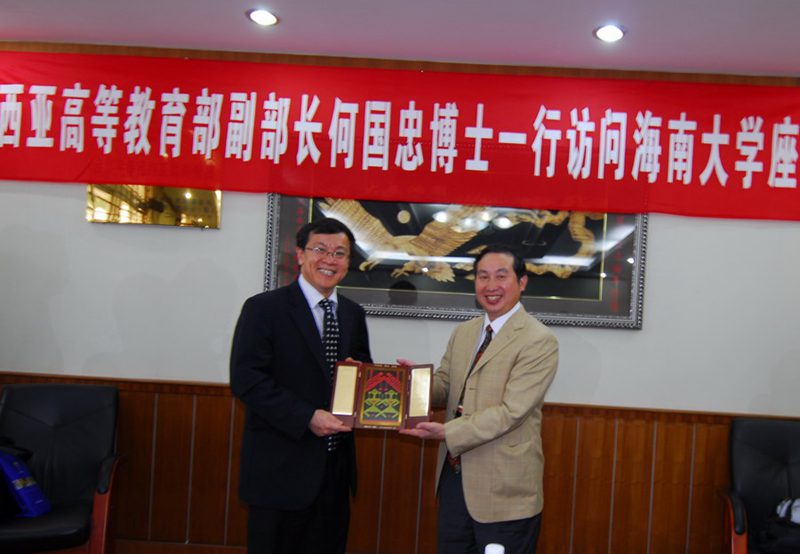 校长李建保教授和副校长严庆教授在办公楼民主党派会议室热情接待了何国忠副部长一行并与来宾座谈。会谈中,双方都表达了进一步加强马来西亚高等教育界和海南大学的联系,促进更深层次的友好交流与合作的共同意愿。座谈期间,我校与来访的马来西亚马来亚大学、敦胡先翁大学、英迪大学、理工大学、拉曼大学等高校的领导或代表探讨了建立校际交流与合作关系,以及如何开展合作事宜。