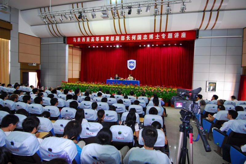 何国忠副部长介绍,中国是东盟的重要合作伙伴,在全球战略和经济中扮演着重要的角色。马来西亚新任首相将于近期组百人代表团访华,与胡锦涛主席会面,商讨马中合作事宜。他说,马来西亚是一个多种族、多语言、多元宗教的国家,却能相互包容,因此政局稳定,经济繁荣。他自己就精通马来语、华语、英语、闽南语、粤语和海南话,中国学生到马来西亚就读不会遇到语言障碍。目前在马来西亚留学的7万多名学生中,中国留学生就有1.4万人,占第一位。马来西亚教育体制沿袭西方的模式,只要提出申请,学校复核材料同意录取,申请者即可赴马来西亚高校就读,不需统考,不必面签,也不用资金担保。就读的成本也非常低,本科生每年学费约6000元人民币,硕士生8000元人民币,博士生1万元人民币,还可以申请奖学金。何国忠副部长笑称自从海口-吉隆坡航线开通以后,从海口飞往吉隆坡只需3小时20分钟,机票只要500元人民币左右,比去北京还省时省钱,他热情邀请我校学子到马来西亚学习深造。何国忠副部长表示,海南阳光灿烂,朋友热情,有回家的感觉,以后他会常回海南,并发动他的同僚多关注海南。