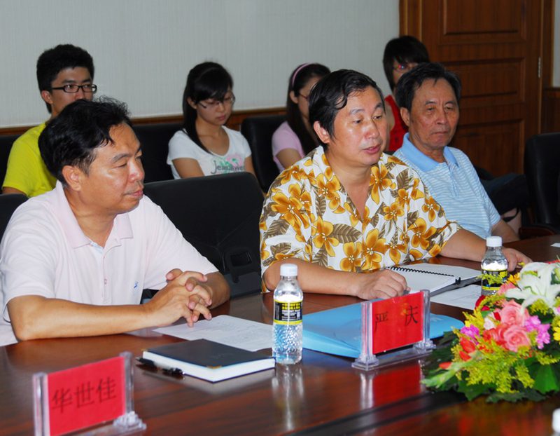 李建保校长(左二)、严庆副校长(左一)海南大学二届理事会副理事长兼秘书长李昌邦(左三)在座谈会现场