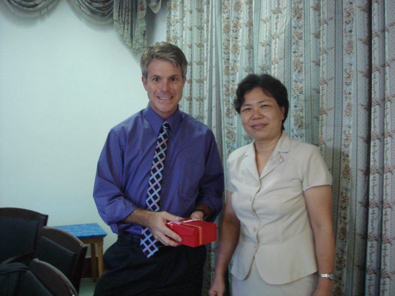 舒马威主任(左一)向儋州校区管委会主任陈琼花(右一)赠送纪念品