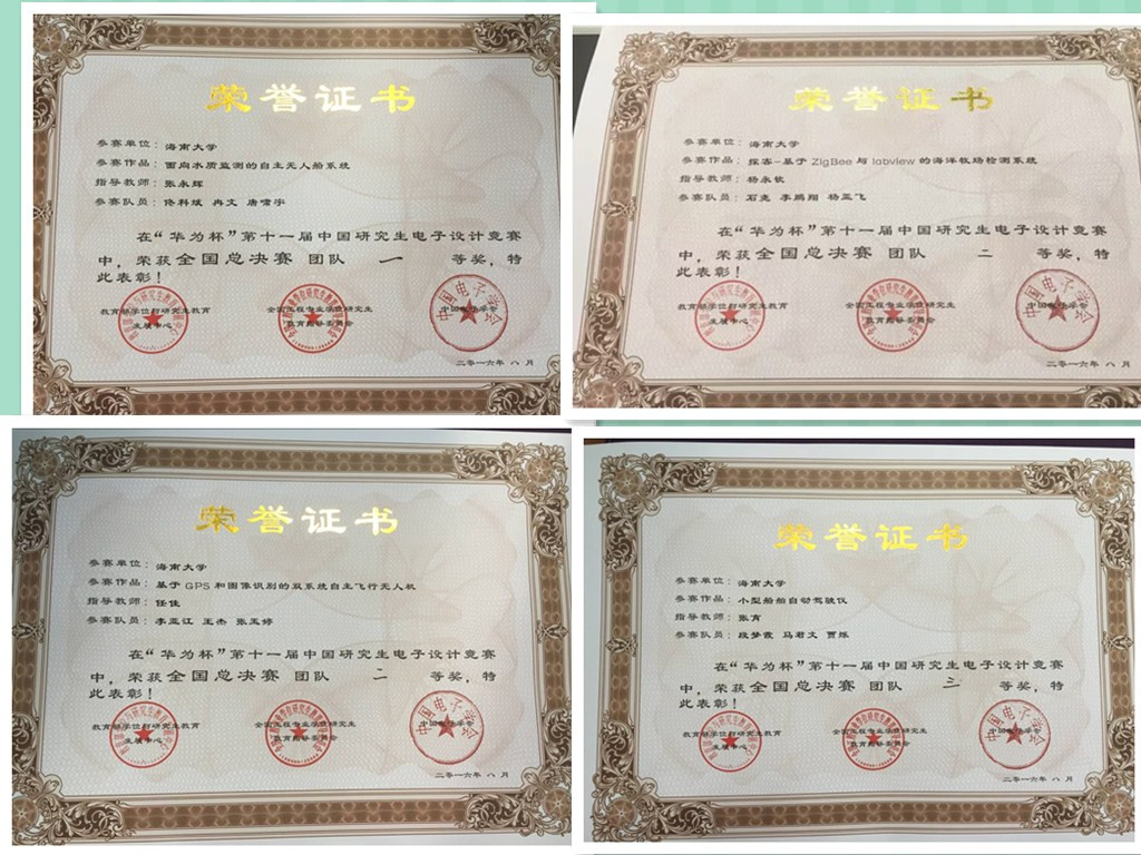 中国研究生电子设计竞赛是一项面向全国在读研究生的团体性电子设计创意实践活动,是由教育部学位与研究生教育发展中心、全国工程专业学位研究生教育指导委员会、中国电子学会联合主办的研究生学科竞赛,是学位中心主办的“全国研究生创新实践系列活动”主题赛事之一。在学校的大力支持下,海南大学从2010年开始连续参加了五届竞赛,今年海南大学共有7支参赛队报名参赛,经过华南赛区初赛有四支参赛队获得华南赛区一等奖,取得决赛资格。