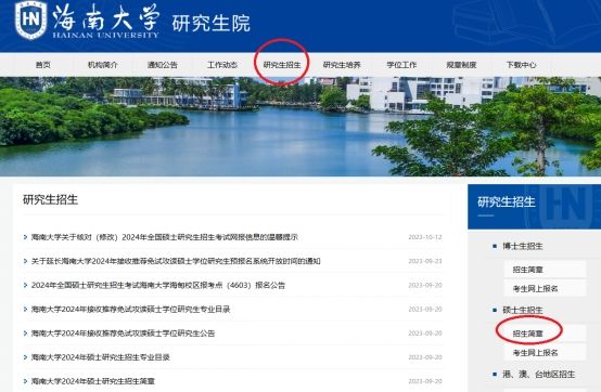 1.登录海南大学研究生院主页,点击“研究生招生”栏,在网页右侧点击“硕士生招生”下的“招生简章”按钮。