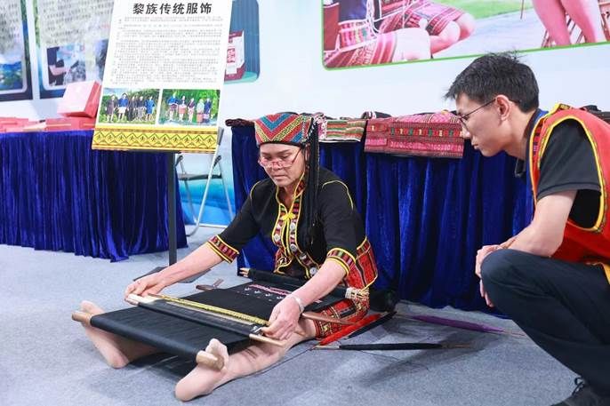 “海南黎族虚拟非遗科普”展上,讲解员展示非遗文创与VR科技的碰撞