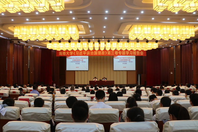 本站讯(记者/摄影 张文沛)10月14日下午,海南大学在社科楼二楼报告厅召开《习近平谈治国理政》第三卷学习报告会暨校党委理论学习中心组(扩大)学习会议。中央党校副教育长兼哲学教研部主任韩庆祥教授应邀作专题学习辅导报告。海南大学全体在校领导班子成员出席报告会。会议由党委常委、副校长曹宪忠主持。期间,中国科学院院士、海南大学校长骆清铭会见了韩庆祥教授,就马克思主义学科建设进行了交流。 韩庆祥作了题为《系统阐述习近平新时代中国特色社会主义思想的纲领性文献—...