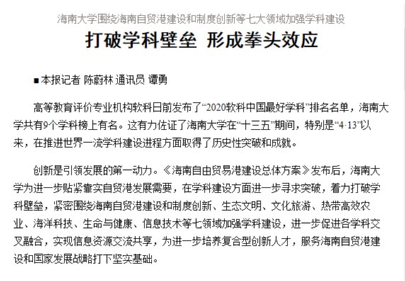 本报记者 陈蔚林 通讯员 谭勇高等教育评价专业机构软科日前发布了“2020软科中国最好学科”排名名单,海南大学共有9个学科榜上有名。这有力佐证了海南大学在“十三五”期间,特别是“4·13”以来,在推进世界一流学科建设进程方面取得了历史性突破和成就。创新是引领发展的第一动力。《海南自由贸易港建设总体方案》发布后,海南大学为进一步贴紧靠实自贸港发展需要,在学科建设方面进一步寻求突破,着力打破学科壁垒,紧密围绕...