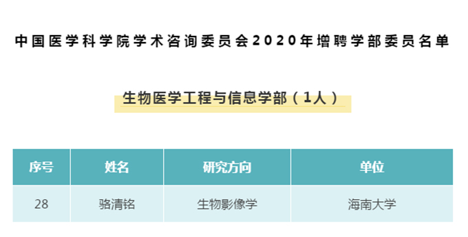 本站讯(记者 潘锭钰)12月18日,中国医学科学院公布学术咨询委员会2020年增聘学部委员名单。中国科学院院士、海南大学校长骆清铭增聘为生物医学工程与信息学部委员。中国医学科学院学术咨询委员会成立于2019年8月,旨在贯彻落实习近平总书记“努力把中国医学科学院建设成为我国医学科技创新体系的核心基地”的重要指示精神,为国家医学科技创新体系与核心基地的建设、国家医学卫生健康事业的发展提供战略咨询和智力支撑。2019...