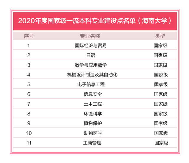 本站讯(记者 余梦月 通讯员 耿刚)近日,根据《教育部办公厅关于公布2020年度国家级和省级一流本科专业建设点名单的通知》(教高厅函〔2021〕7号),海南大学再添11个国家级一流本科专业建设点和18个省级一流本科专业建设点。 截止目前,我校共有国家级一流本科建设点25个,省级一流本科专业建设点24个。2019年4月,教育部启动一流本科专业建设“双万计划”,计划将在2019年至2021年,建设1万个左右国家级一流本科专业点和...