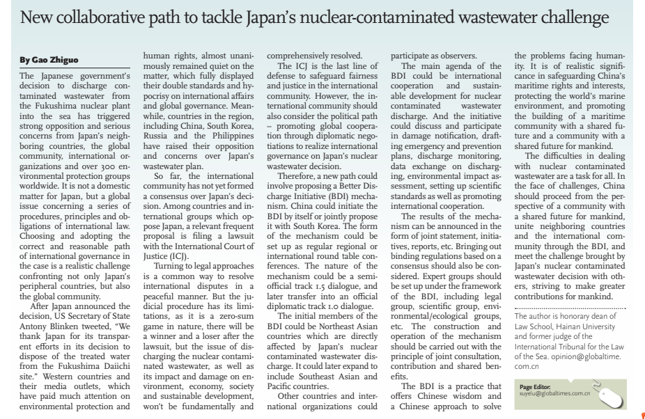 本站讯(记者 王梦洋)4月30日,《环球时报》刊发海南大学法学院特聘院长高之国署名文章“New collaborative path to tackle Japan’s nuclear-contaminated wastewater challenge”(合作应对日本核污染废水挑战的新途径)。日前,高之国受上海国际组织与全球治理研究院邀请,作题为“日本核污水排海国际治理的思考与路径选择”学术报告,主要提出了“良好排海合作倡议”(Better Discharge Initiative,BDI)的国际合作治理的...