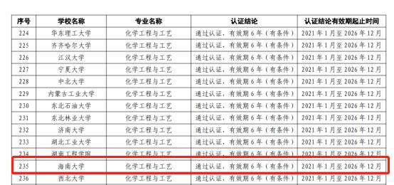 本站讯(记者 刘雯箐 通讯员 刘燕霞)日前,中国工程教育专业认证协会正式公布了2020年工程教育专业认证结论,全国共305个专业通过认证,海南大学化学工程与工艺专业名列其中,认证有效期为6年(2021年1月至2026年12月)。截至目前,海南大学已有食品科学与工程、化学工程与工艺两个专业通过中国工程教育专业认证,标志着这两个专业人才培养质量达到国际实质等效水平,进入全球工程教育“第一方阵”。 认证工作是提高专业人才...