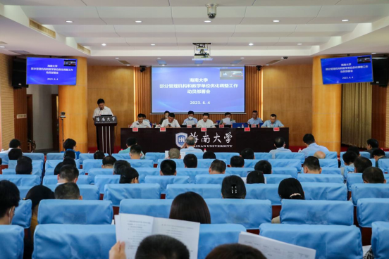 本站讯(记者 王一钦 梁现战 戎蓉)6月4日上午,海南大学部分管理机构和教学单位优化调整工作动员部署会在办公楼一楼报告厅召开。海南大学党委书记符宣国,校长、中国科学院院士骆清铭(线上),党委常委和校领导梁谋、曹兵、郑尉杰、高佃恭、邱锡光(线上)、曹宪忠、陈骏、韩淑梅、谭勇、陈明宝出席会议。会议由梁谋主持。会议现场。 戎蓉 摄符宣国作《调整优化学科专业结构 推进学校高质量发展》的主题讲话。符宣国指出,习近平总书记在中共中央政治局第五次集体学习时的重要讲话阐释了建设教育强国的重要意义,...