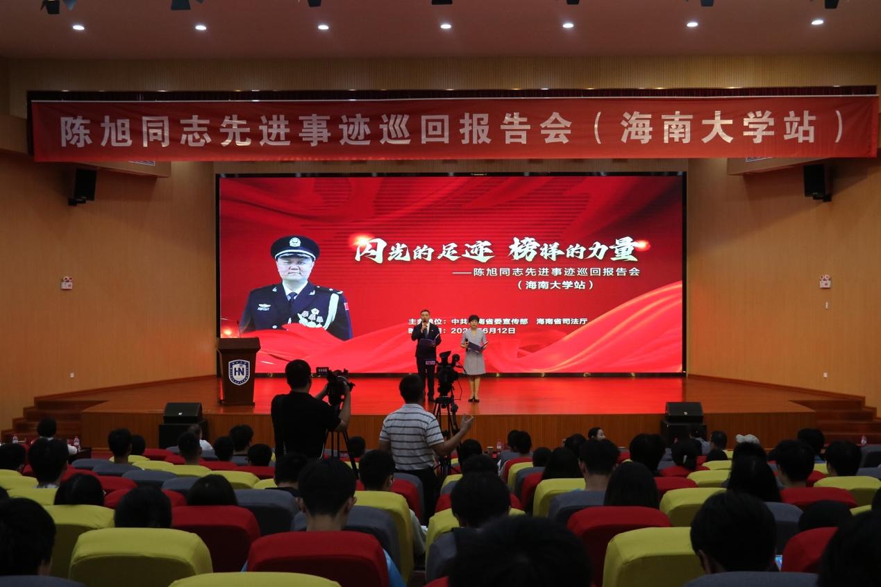 本站讯(记者 杨婕)6月12日上午,“闪光的足迹 榜样的力量——陈旭同志先进事迹报告会”在田家炳二楼报告厅举行。海南省司法厅二级巡视员郑华生;海南大学党委书记符宣国,党委常委和校领导高佃恭、韩淑梅参加报告会。 报告会现场。杨婕 摄报告会上,由陈旭妻子孙官梅、同事陈海燕和彭博、受助人员阿雄和新闻媒体记者栾子洲共5人组成的先进事迹报告团,分别讲述了陈旭同志29年如一日扎根司法行政基层一线的感人事迹。“陈旭同...