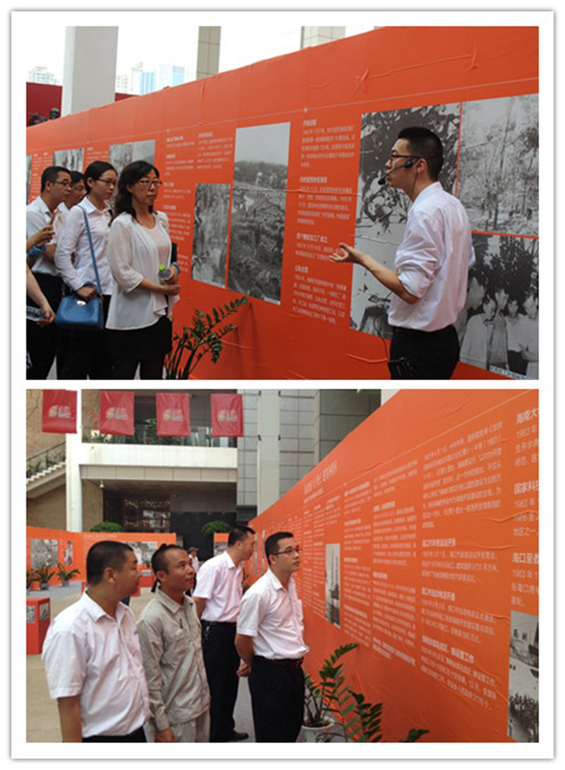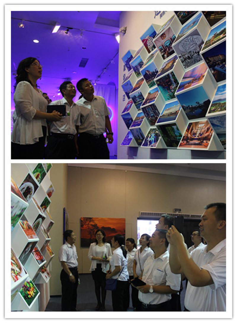 本次图片展设红、橙、绿、蓝四个展区,分别代表着解放、创业、绿色崛起、走向未来。在观展过程中,大家一边听取讲解,一边认真观看展板上的图片和文字,重温65年来海南这片热土上从荒到兴、从小到大、翻天覆地的变化。在蓝色的展区里,图片除了汇集了海南星级酒店、海南美食,还有最为全面、系统的海南户外旅游旅居方式,大家盯着一张张美不胜收的照片以及富有创意的视觉设计赞叹不已,他们纷纷拿出手机拍照。