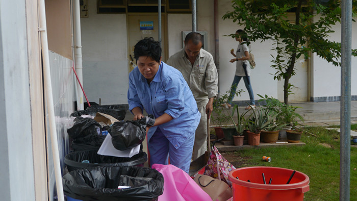 校园服务中心的虞道珍与住宅区的蒙海波两人进入集团工作至今已有10多个年头了。为了让校园更加干净整洁,丈夫虞道珍每天与垃圾车结成了好伙伴,将加班当成了业余生活。每天早上6点钟就起床跟随着垃圾车开始一天的工作。如果遇上节假日或者台风暴雨,校园的生活、绿化垃圾剧增,为了及时将垃圾运走,他加班加点更是家常便饭。日复一日,年复一年,他从无怨言。
