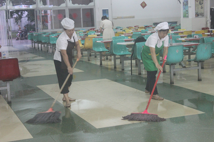 6:20,食堂的卫生工吴瑞琴与同事对餐厅的地板进行保洁。
