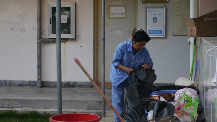 7:40,公寓楼的王琴花在将学生们各种各样的垃圾进行分拣、清运。