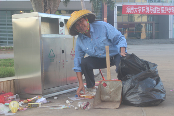 我们的校园里,每天在我们的身边都会出现环卫工熟悉的身影。但是,或许因为平日忙于各自的工作,很多人没有时间记录自己工作的点点滴滴,他们劳动时最美的瞬间很少被记录。10月26日是海南省第十三届环卫工人节,这是一个为环卫劳动者而设的节日。这个伟大的节日里,我一早就起来,迎着晨曦,在校园、宿舍、教室、食堂等场所用镜头去记录他们工作中的美丽瞬间,向每一位校园的环卫工作者致以最诚挚的敬意。