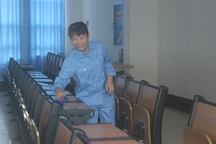 6:45,教学楼环卫工王琴把每一间课室打扫得干干净净,迎接师生上课。