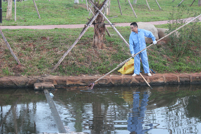 6:30,校园环卫工人黄先兵,抄起网兜正在打捞凤凰花溪里的枯枝落叶等杂物。