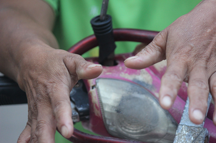 在今天的体验环卫工劳动的过程中,一位女环卫工的手引起我的注意。当我让她伸出双手拍照时,她有些不好意思,因为她的手同其他环卫工的手一样,但大都又粗又短,每一指节都凸起老高;虎口间堆了重重叠叠的老皮,手掌几乎是一团硬茧,皮肤干燥、皲裂……