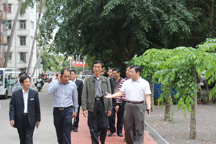 何忠平副校长(右一)陪同林杰副主席(右二)在教工区检查