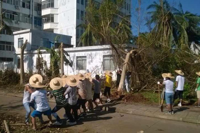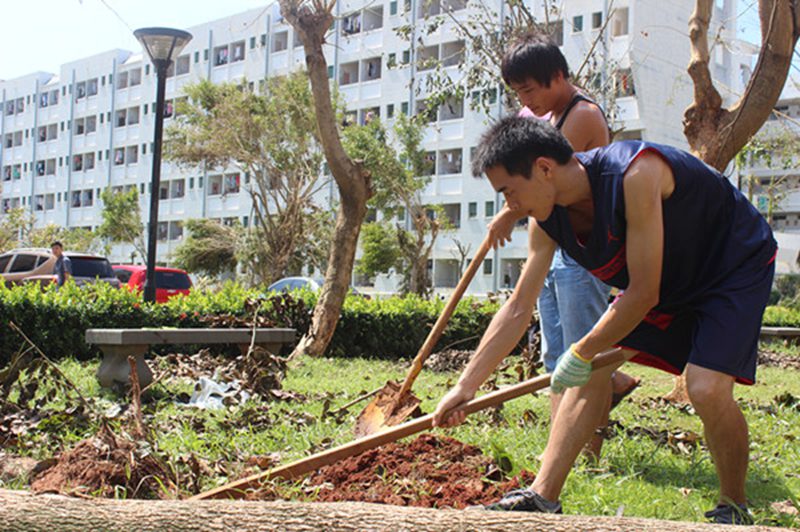 22日上午,在学生区15号楼前,几名学生与后勤人一起拿起铁铲挖坑、扶树,干得热火朝天,后来才得知他们是今年的毕业生,其中一名姓彭的同学今年9月继续在本校就读研究生。他说看到母校受到台风重创后,就号召了两名要好的同学加入到救灾队伍中来。“这个危难时候能够为学校做点力所能及的事是一件很开心、光荣的事情。”他自豪地说。