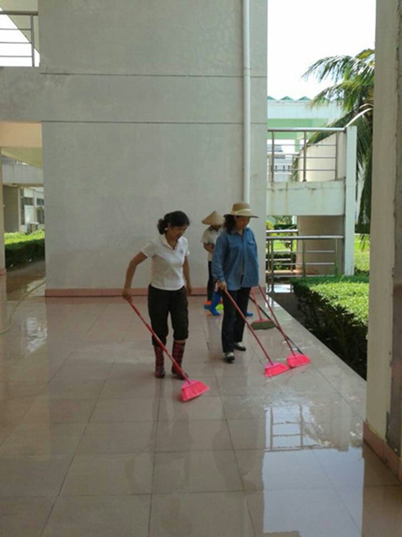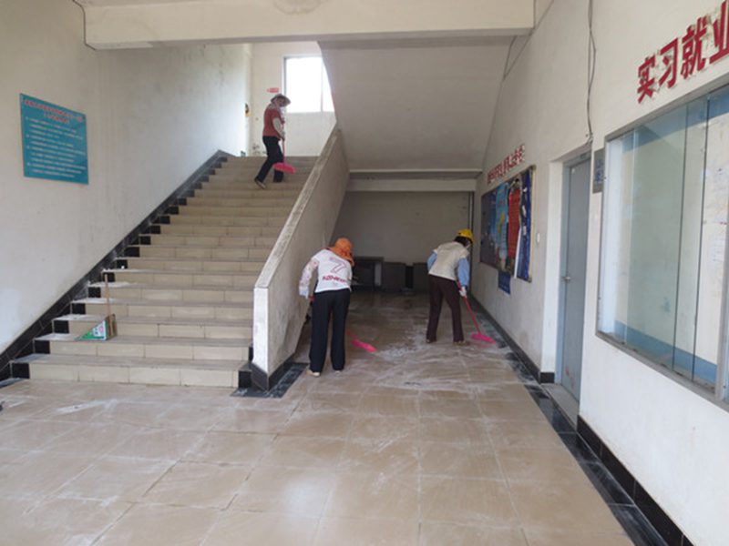 接到任务后,项目责任人吴克用和员工立即对考场走廊的垃圾及石灰进行清理,并用水进行冲洗,拖干,对考场教室的地板、门窗、桌椅等进行卫生清理。员工周清美说:“脱落的石灰粉清理难度较大,走廊至少要拖6遍才干净”。经过员工的一起努力,考场所需的教室基本清理干净。