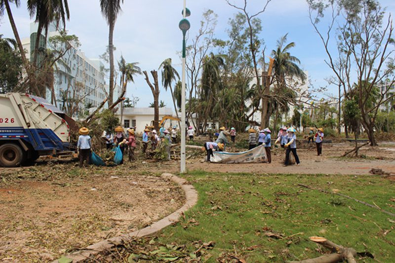 “我们的工作就是校园绿化养护,道路保洁,垃圾清运,创造一个美丽整洁的校园环境,然而台风过境,使得校园满目沧桑,一片狼藉,我们心痛不已,但也无力阻挡,只能夜以继日的清理枯枝烂叶、清运垃圾、救扶树木,尽早恢复昔日美丽的校园环境……”校园服务中心主任邓培一边说一边忙着手里的活。