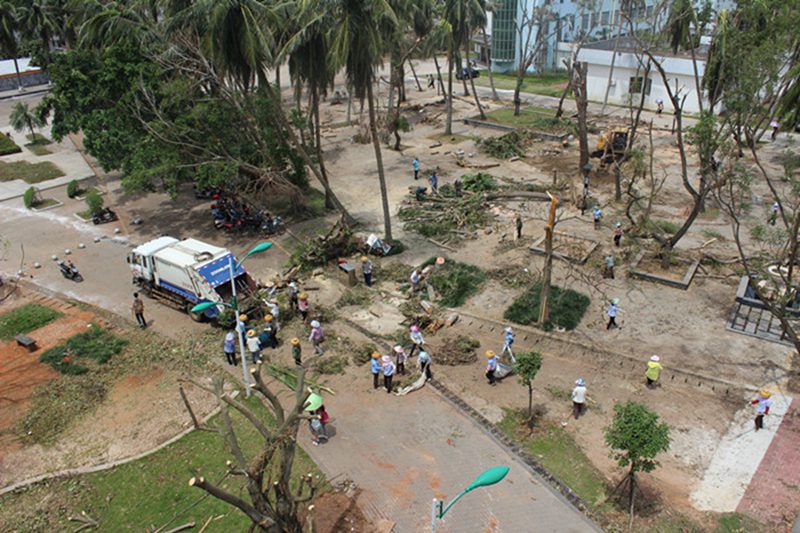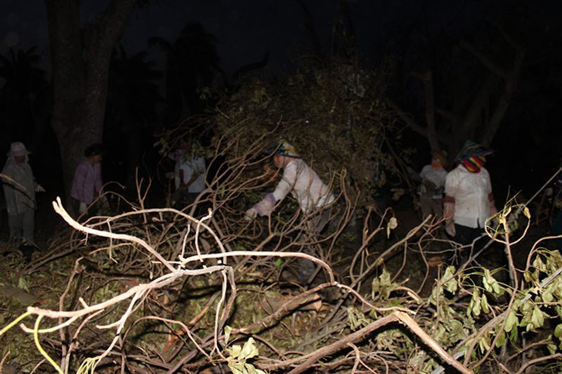 7月22日,这支队伍一大早,四组在分工协作的扶救树木、清理路面装运垃圾,经过大家的不懈努力,除社团一条街外,所辖区域路面全部清理干净。并有三名机械工跟随教工区、学生区、教学区切割大块树干,协助清运工作。当天累计清运绿化垃圾268吨、扶救树木352棵。