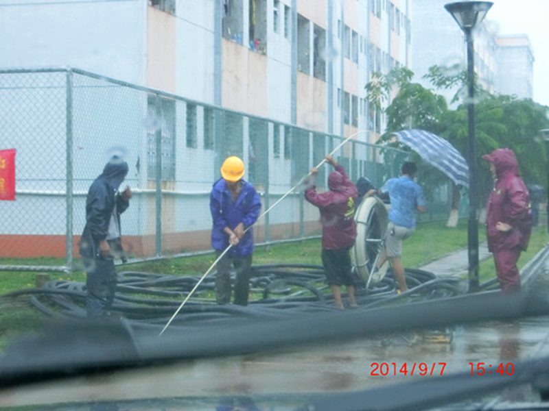 8日上午,电缆顺利运回海口,水电服务中心立即组织维修人员冒着大雨,挖沟、放线、套管、埋线……,一切紧张有序,经过紧张抢修,8日中午1点钟,受损线路全部修复完毕,第五食堂全面恢复了供电。