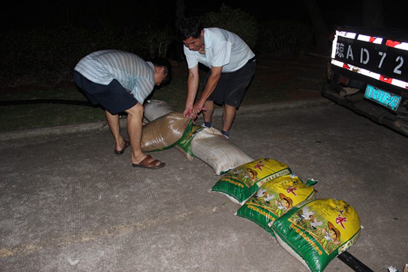 工作人员正在用沙包掩护过路电缆