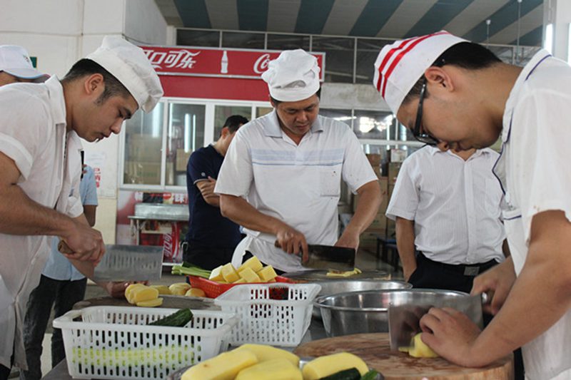 4月21日,第一食堂热闹非凡,切菜声、炒菜声、喝彩声此起彼伏。由饮食服务中心举办的厨艺技能比武正在紧张进行中。