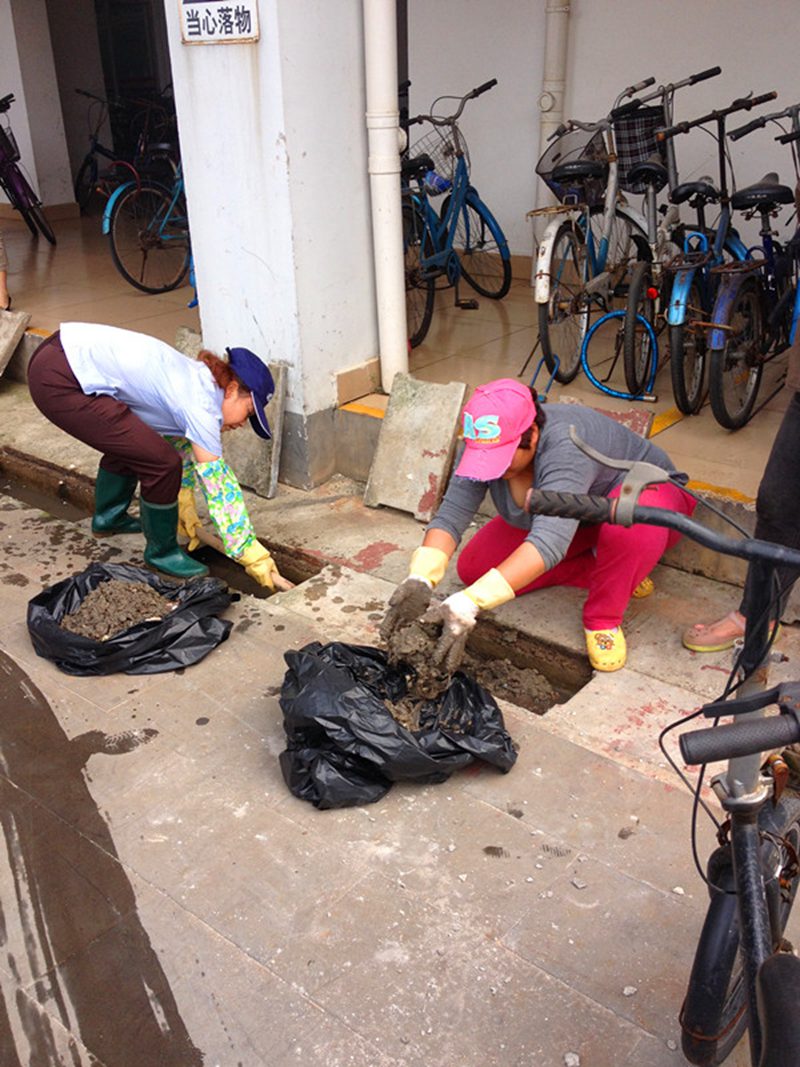 在清理现场,大家分工协作,干得热火朝天,有的用锤子、铲子去掉地板上的水泥渣,有的用药水清理地板上的污渍,有的用水对地板进行冲刷清扫。在清理排水沟时,为了避免损坏埋在水沟里的管道,工作人员只能用手提起埋在水沟里的管道,再用手掏出水沟里的赃物。