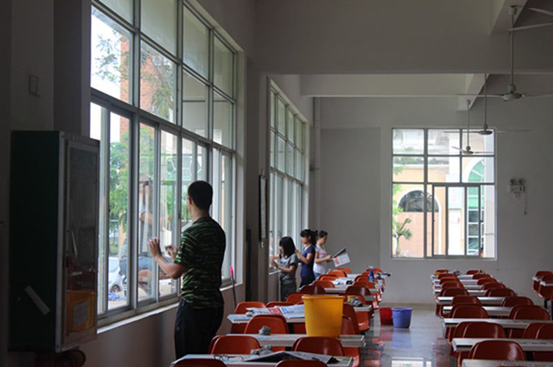 笔者在第六食堂看到,参加劳动的人员手拿抹布、扫帚等清扫工具,有的擦拭门窗,有的清理水沟,有的冲洗地面……大家干得热火朝天。特别是8名勤工助学岗的学生,把窗户擦得看上去就像没装玻璃一样晶莹透亮,学生李佰灵看着大家清洁过后干净整洁的食堂,开心地说:“在这样的环境下用餐,我更放心了。”