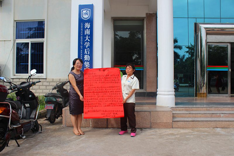 杨老师在感谢信里还写到:“邱阿姨平常也负责我们这个区域的卫生清扫工作,她工作非常认真,一丝不苟,每天清晨和中午都定期打扫区域卫生,她对我们这些住户热情友善,乐于助人,经常帮我们看个东西,拧个包的,就像自家人。邱阿姨的善举,令我激动万分,彻夜难眠,后勤集团培养了如此优秀的员工,实在是海大教师之幸事,海南大学之幸事。