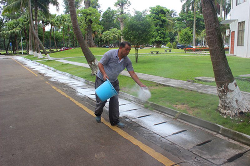 由于昨日下午的持续大雨,导致海甸校区多路段被淹,化粪池、水沟等脏物被冲上路面,为了防止雨后细菌滋生,6月12日上午,校园服务中心组织人员清理赃物及枯树枝,并且安排洒水车对全校区道路路面进行洒水冲洗,对管辖区域内水沟、污水井盖和落沙井进行洒石灰消杀,确保校园环境卫生安全。