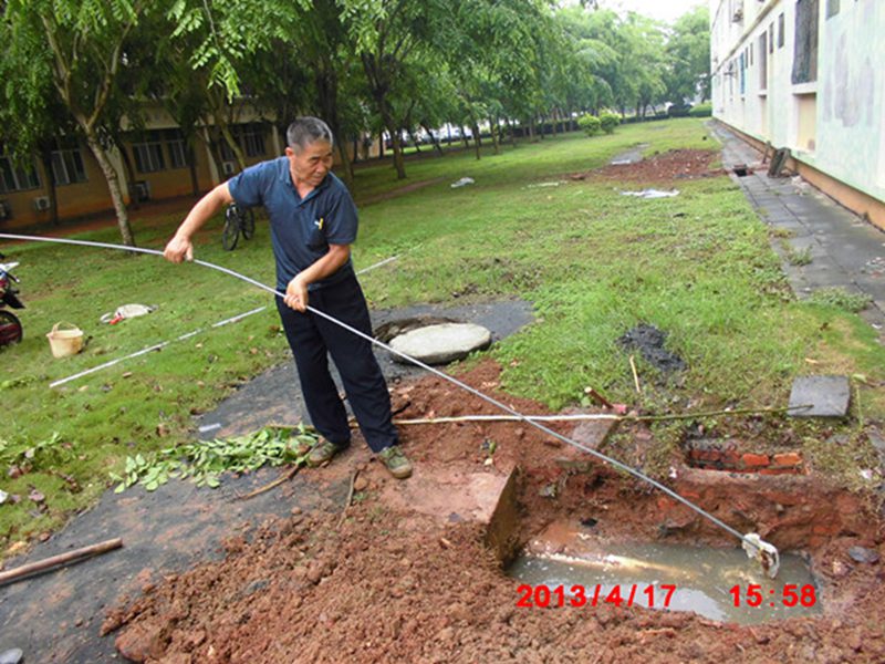 “学生宿舍区的管道堵塞的原因大多数是学生将毛巾或者塑料袋等杂物仍入管道内引起的,这杂物在管道内天长日久,造成管道内径变小,形成堵塞。”该班组中年龄最大的朱德富用一边用一条长长的钢筋从破口处伸进管道内进行疏通一边分析道。