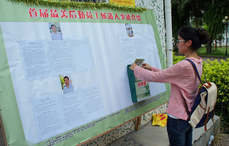一位路过食堂去吃饭饭的老师也主动咨询笔者如何进行投票,并告诉笔者:“这个活动我很喜欢,也很有意义。通过这个活动可以让更多的师生了解到默默无闻的后勤人,了解他们的事迹,你就会发现,原来美丽就在我们的身边。”