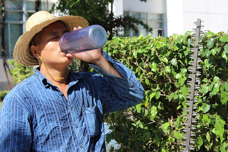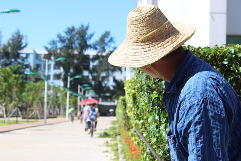 在他歇息片刻,他拿起水杯大口的喝水,衣服也被汗水浸透了。他说:“我来海大工作13年了,现在每天负责从实验中心楼到东门这片区域的绿化修剪工作,面积大,加上这段时间高温和降水双管齐下,植物生长很快,两三天不修剪的话,长势很快,即使在早上10点,阳光特厉害了,长时间的工作让人感觉头在发昏。
