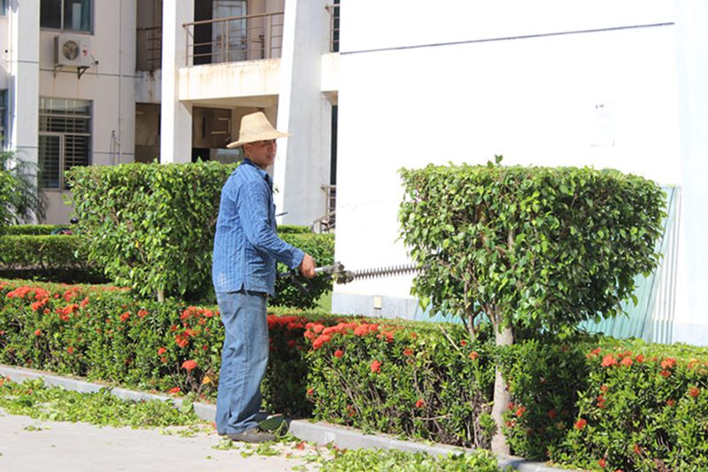 在实验中心楼附近,机械工陈广杰戴着草帽,手里挥动着绿篱机正在对灌木花卉进行修剪,锋利的刀片在他指挥下快速的旋转,在百米的道路上,树叶散落得一路都是,他修剪完后还不时水平地瞄了一下,看看是否修剪整齐。