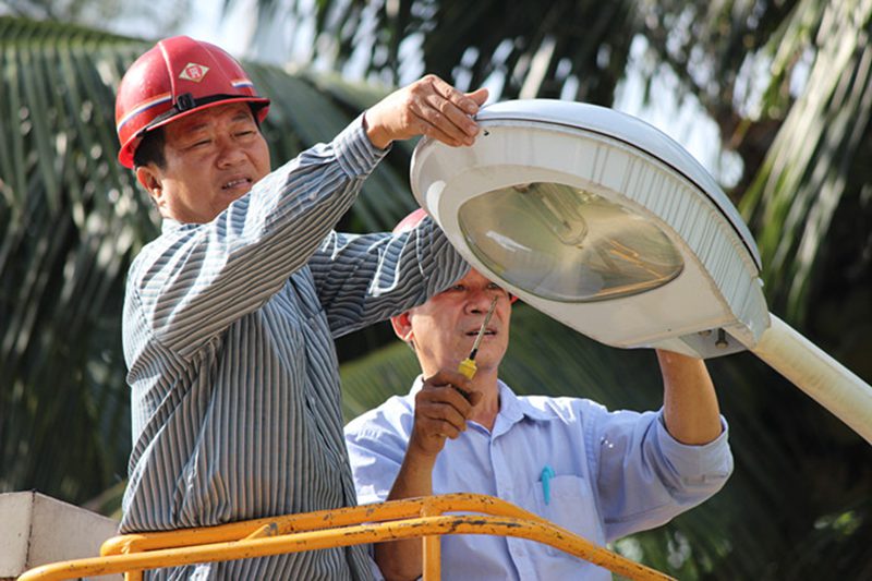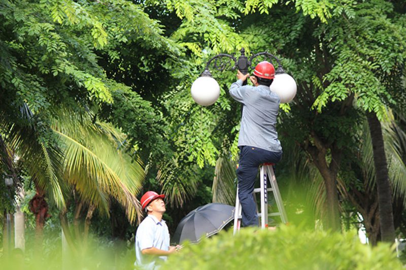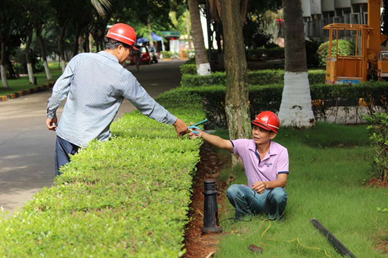 上午9点多,笔者跟随维修部的工作人员来到校园各路段进行路灯维修作业。陈元业、郭涛、林鸿波、陈建海等人员头戴安全帽正在烈日下更换路灯作业,在高空作业车的上,林鸿波、陈建海两位师傅正在小心翼翼地将烧坏的灯泡拆下,然后又将一个250瓦的灯泡装上去,强烈的阳光照在身上,火辣辣的,半个小时过去了,汗水已经浸透了他们的衣服。他说,由于气温太高,校内师生用电量剧增,电力设施超负荷运转,加上阳光炙烤,故障频出,这个季节也是我们维修人员最忙的时候,就在维修的过程中,陈元业又接到了两处需要维修故障的电话。