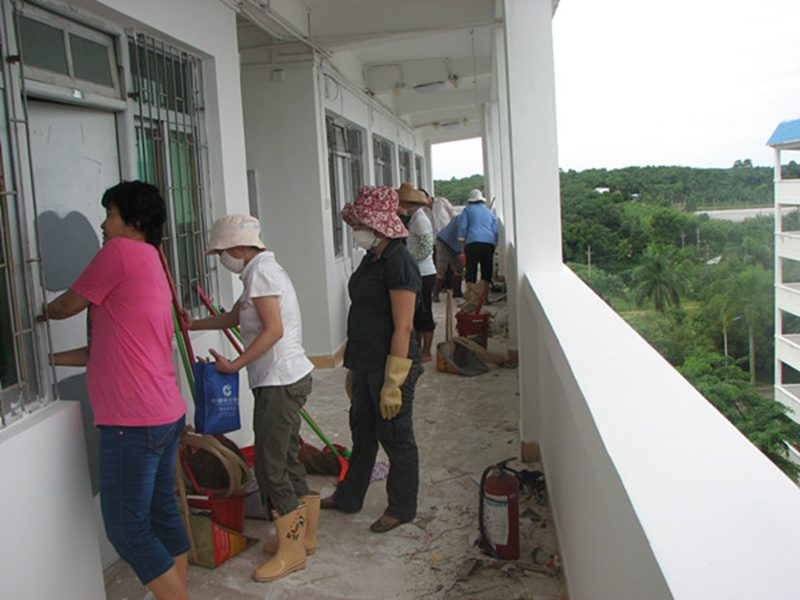 近日,儋州校区暑假学生宿舍维修改造工程相继完工,但是工程现场却留下不少建筑垃圾。图为物业服务中心组织40多名员工先后对A7、A8及13栋宿舍改造留下的垃圾进行全面到打扫清理,为新生们营造一个舒适清洁的生活环境。