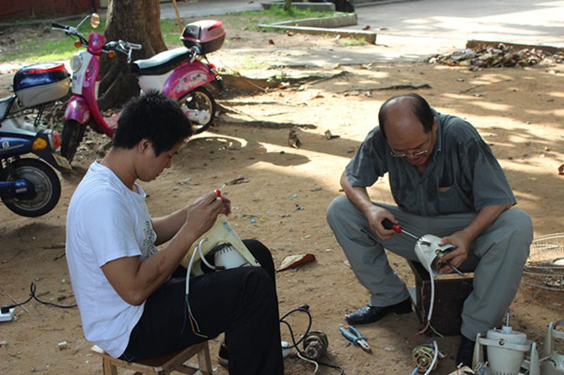 暑假期间,工程中心维修师傅对学生宿舍内的家具,灯具、风扇等物品进行更换、维修,确保在新学期开学前完成。图为吴才光师傅和同事在维修风扇。 文/图: 集团党办