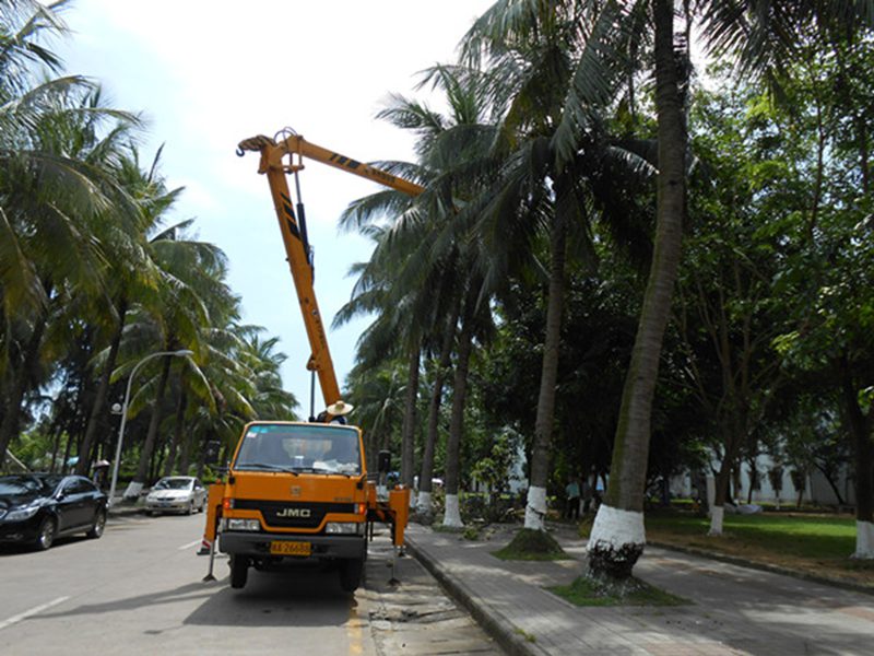 8月26日,校园服务中心主任邓培组织工作人员清理校园内行人走动较为频繁区域的枯枝枯果,确保新生的人身安全。图为工作人员用高空作业车清理枯椰果。 文/图:吴钟武