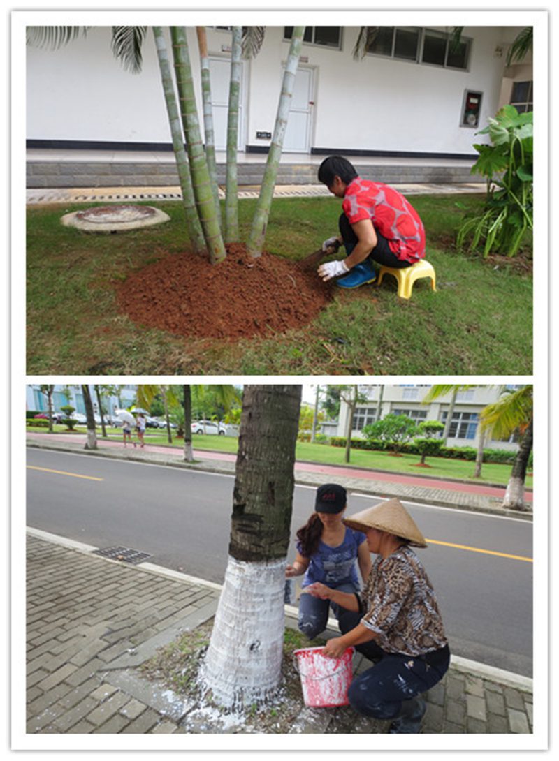 为给新同学们营造整洁的校园环境,教学区、学生区、住宅区、校园等中心的员工放弃暑假休息,组织人员对校园环境进行打扫,以整洁的校园面貌迎接新学期的到来。图为(上)教学楼的工作人员对的花草、树木、绿篱进行培土;(下) 工作人员对树木进行粉刷。 文/图:陈宝