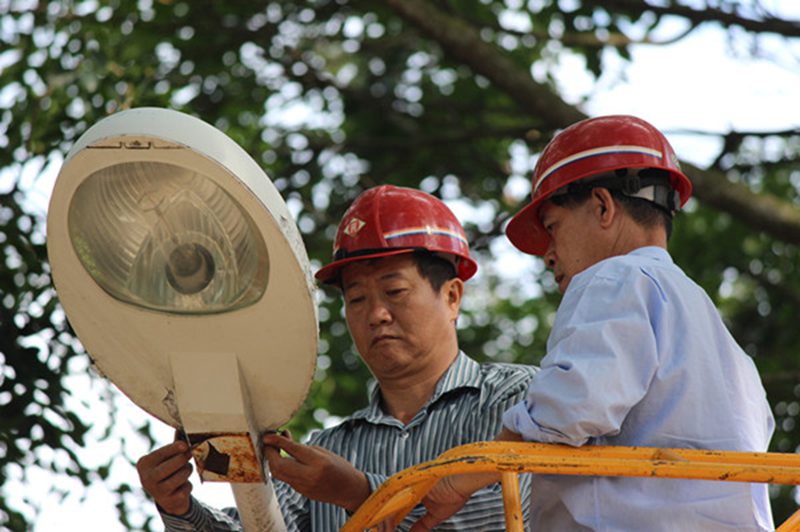 8月26日,水电服务中心维修工作人员对校园的路灯进行检修。为提高路灯使用率,维修工作人员开学前对校园路灯及附属设施进行全面检修,目前已维修路灯40余盏。图为陈建海、林鸿波师傅在维修路灯。